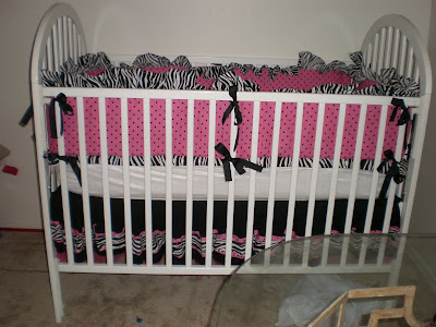 I finished my crib bedding today. And here are some pics of it. For those of you who voted... I picked #3 i think. My mom is disappointed with it cuz we put cute pink toole at the bottom, and the railing cuts it off... but it will show in a couple months when I have to lower the crib bed down.